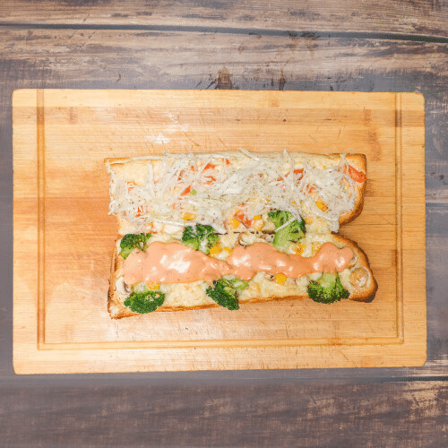 mit Broccoli, Paprika, Champignons, Zwiebeln, Tomatensauce und Käse