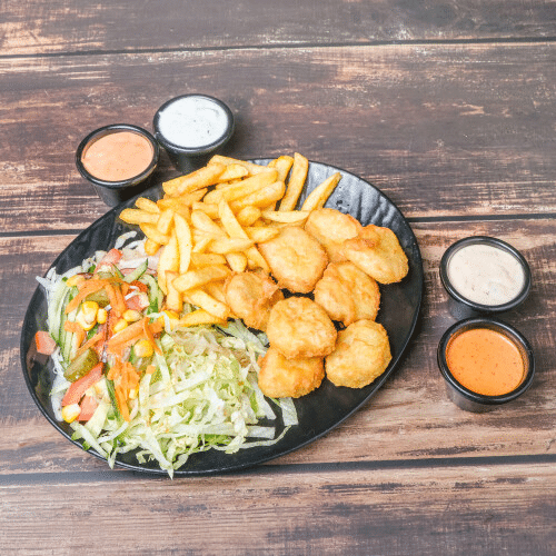 Alle Gerichte werden mit einer Fleischsorte nach Wahl, Eisbergsalat, Gurken, Tomaten, Zwiebeln, Kraut und einer Sauce nach Wahl zubereitet.